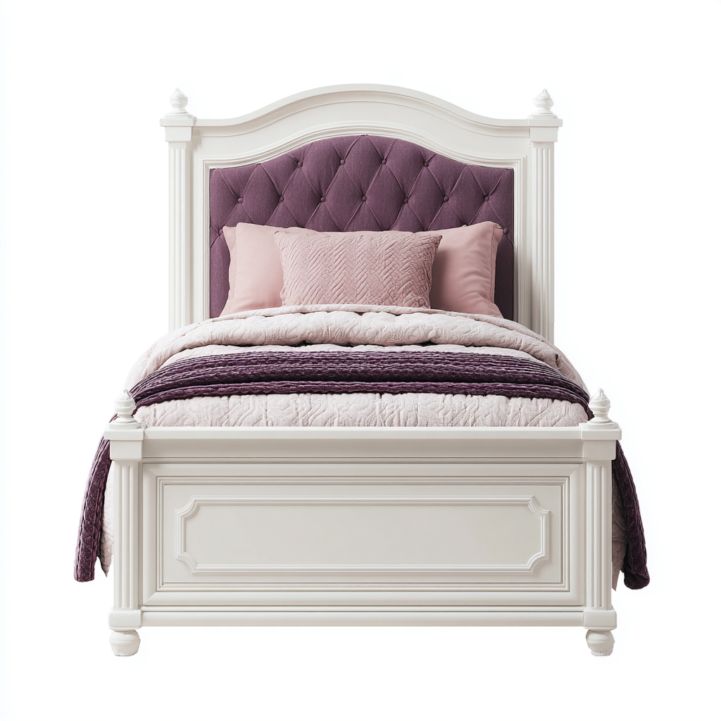 Estructura fabricada en madera con acabado blanco uniforme. El cabecero está tapizado en tejido acolchado de color morado, con un trabajo decorativo visible que aporta textura y profundidad visual.