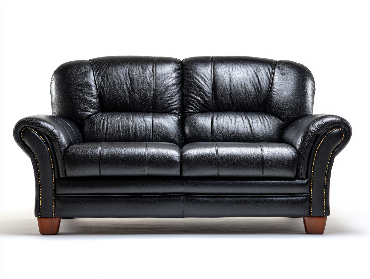 Tapizado en cuero sintético de color negro con acabado liso y brillo suave. La estructura interna garantiza estabilidad y resistencia, mientras que los detalles de costura y los reposabrazos curvados refuerzan su carácter tradicional.